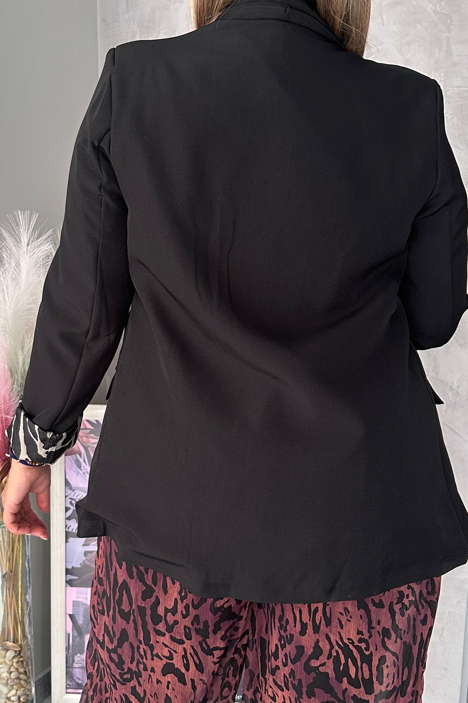 Un blazer elegante y versátil con un toque atrevido que lo hace único. Su exterior en color liso contrasta con el forro interior de estampado animal print, que también se deja ver en las mangas al doblarlas, aportando un extra de estilo y personalidad.