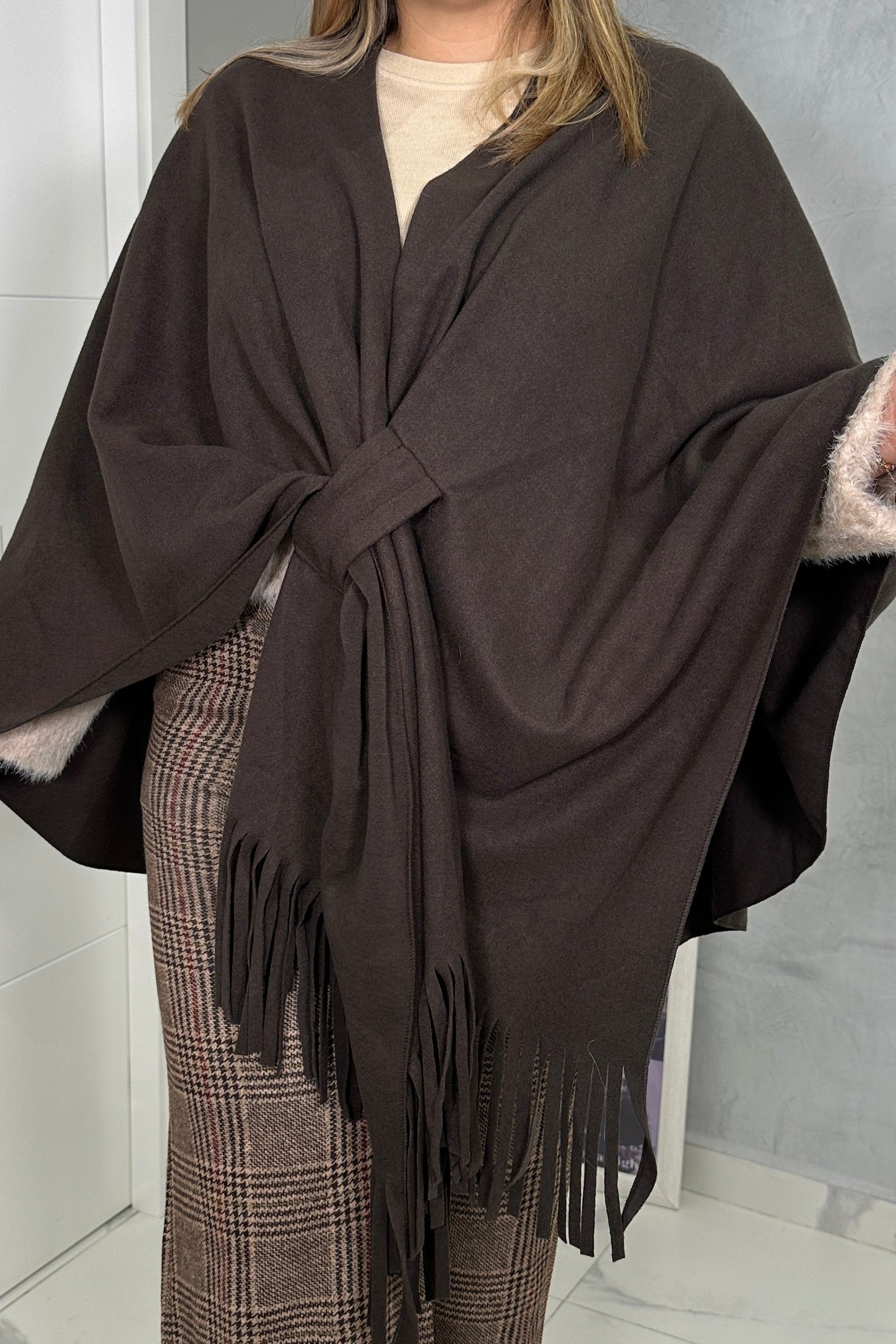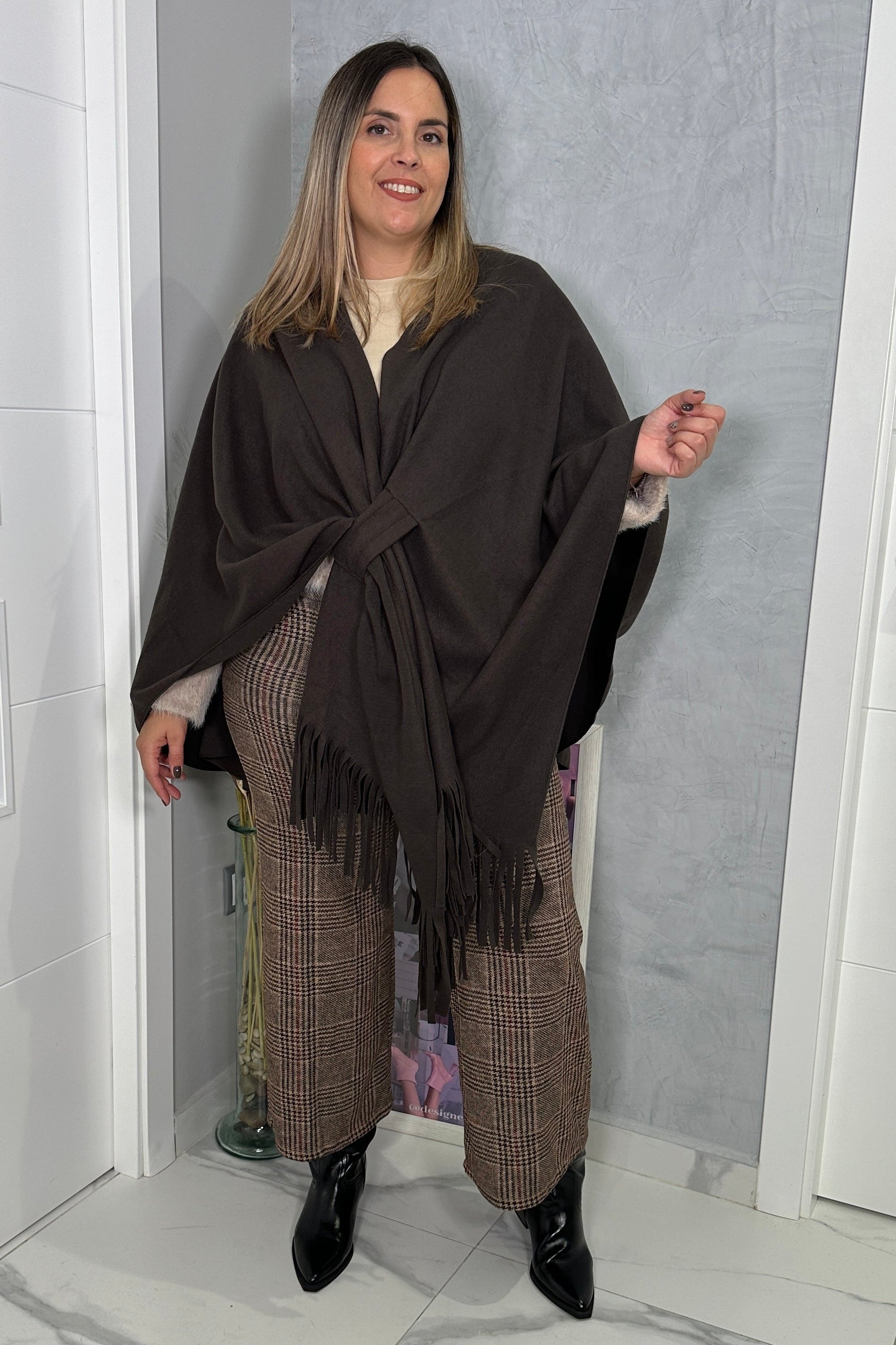 La Capa Nudo Chic es esa prenda que transforma cualquier look en segundos. Su diseño envolvente con detalle de nudo delantero y flecos en el bajo le dan un toque elegante y sofisticado, sin renunciar a la comodidad.