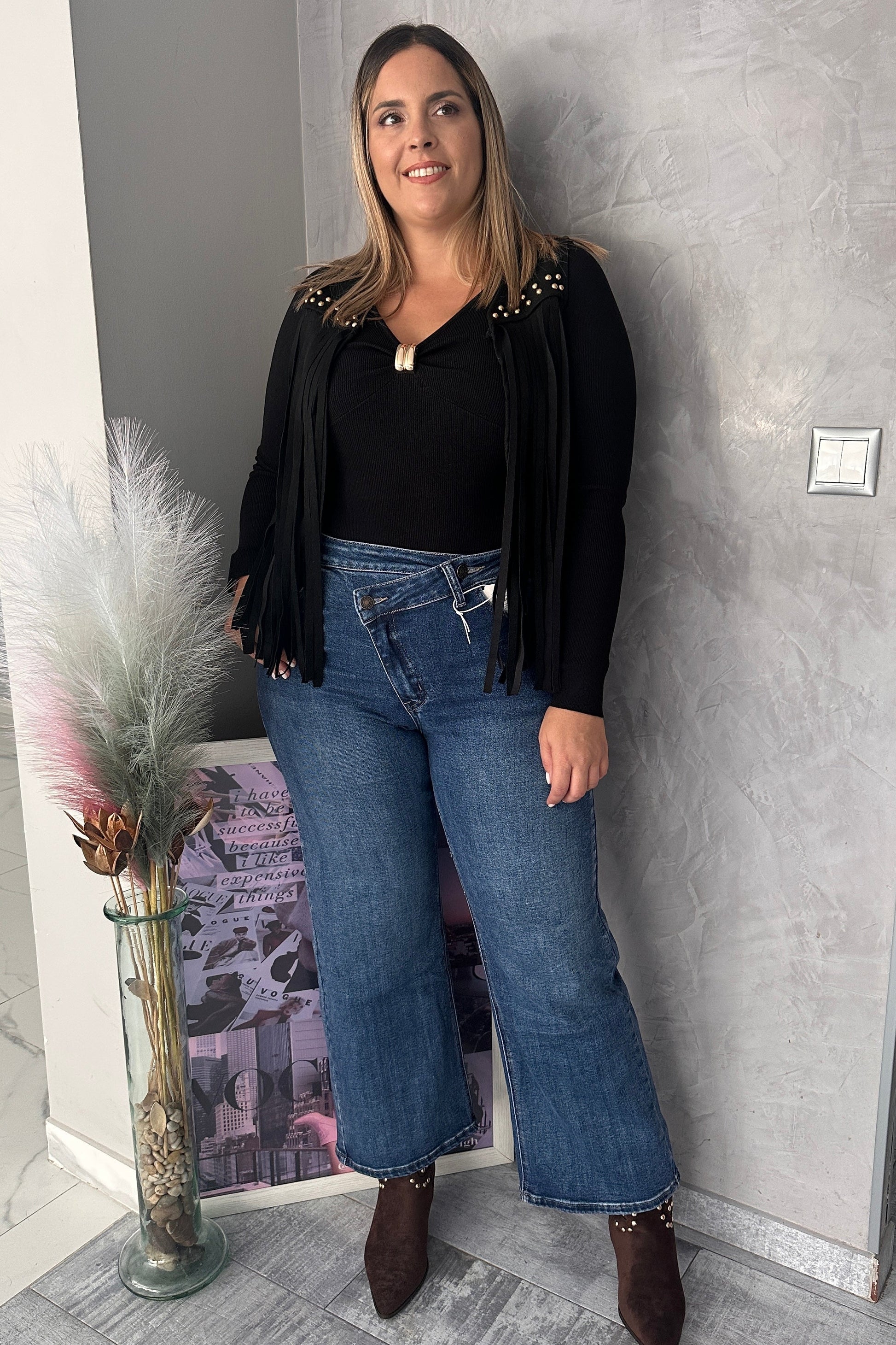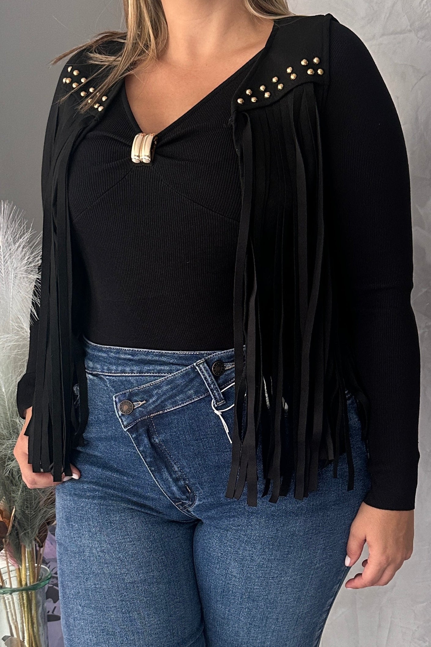 Aporta un aire boho y moderno a tus looks con este chaleco de flecos. Diseñado en tejido suave, cuenta con tachuelas doradas decorativas en la parte superior y largos flecos en cascada que aportan movimiento y estilo único. Disponible en más colores para que encuentres tu favorito.