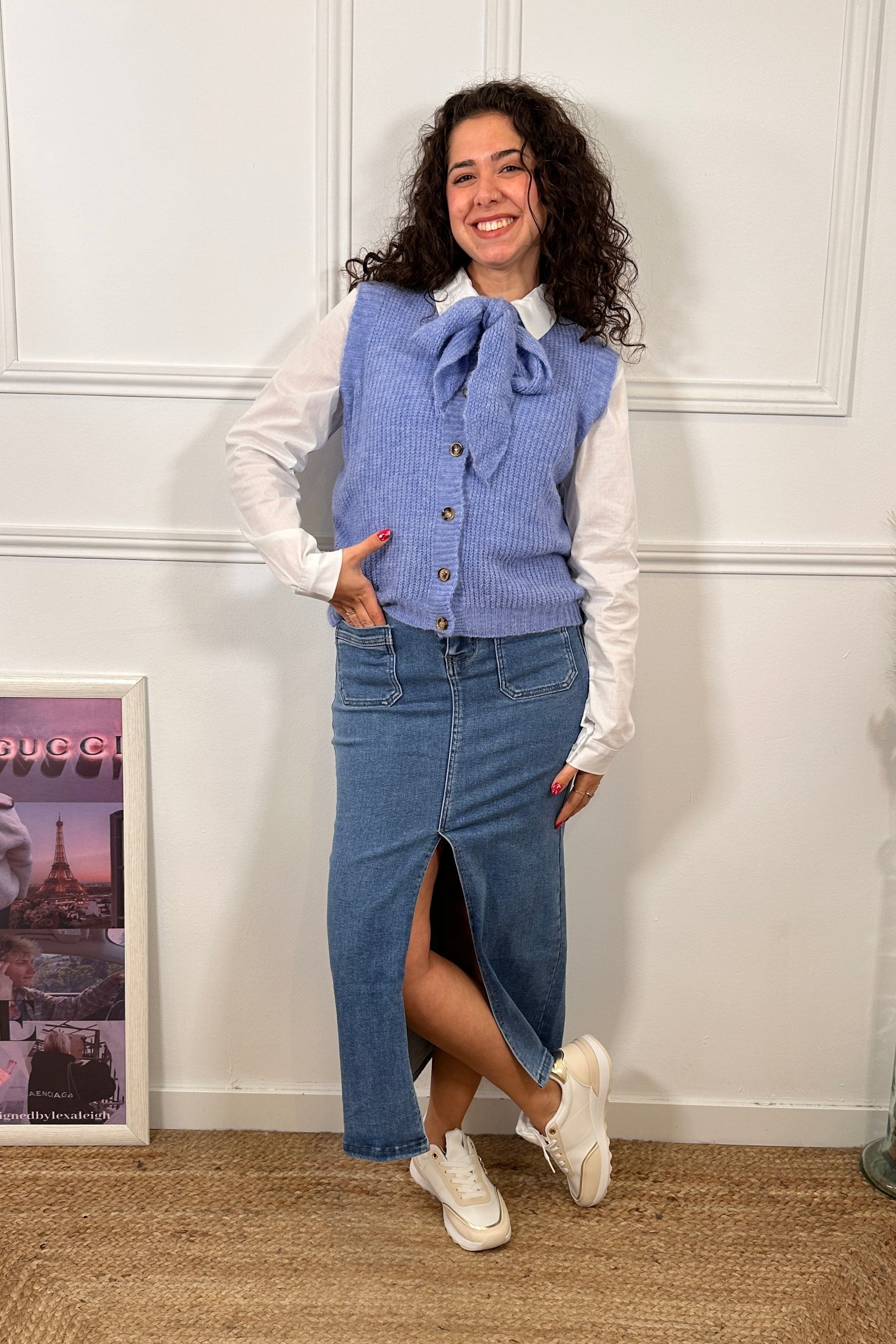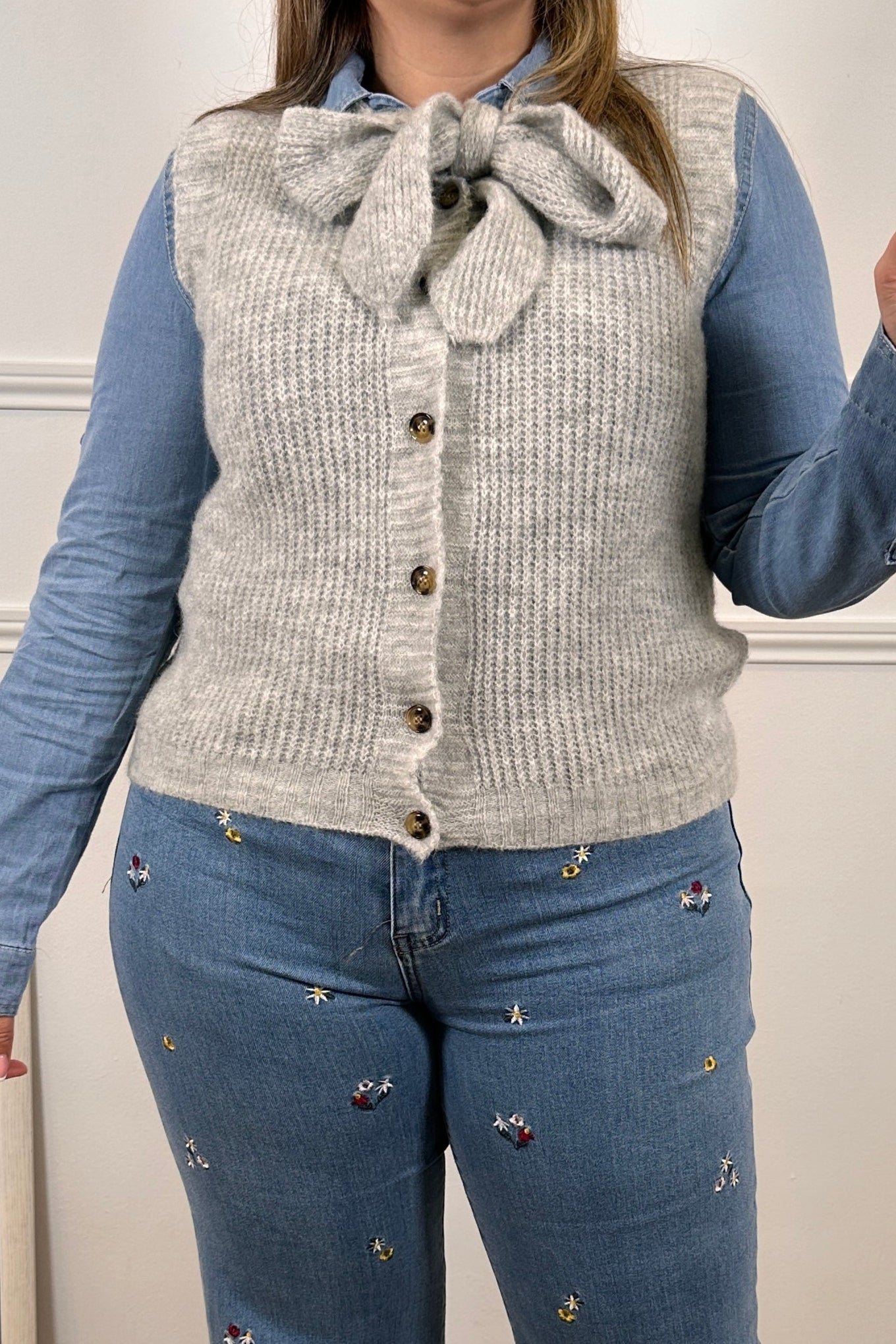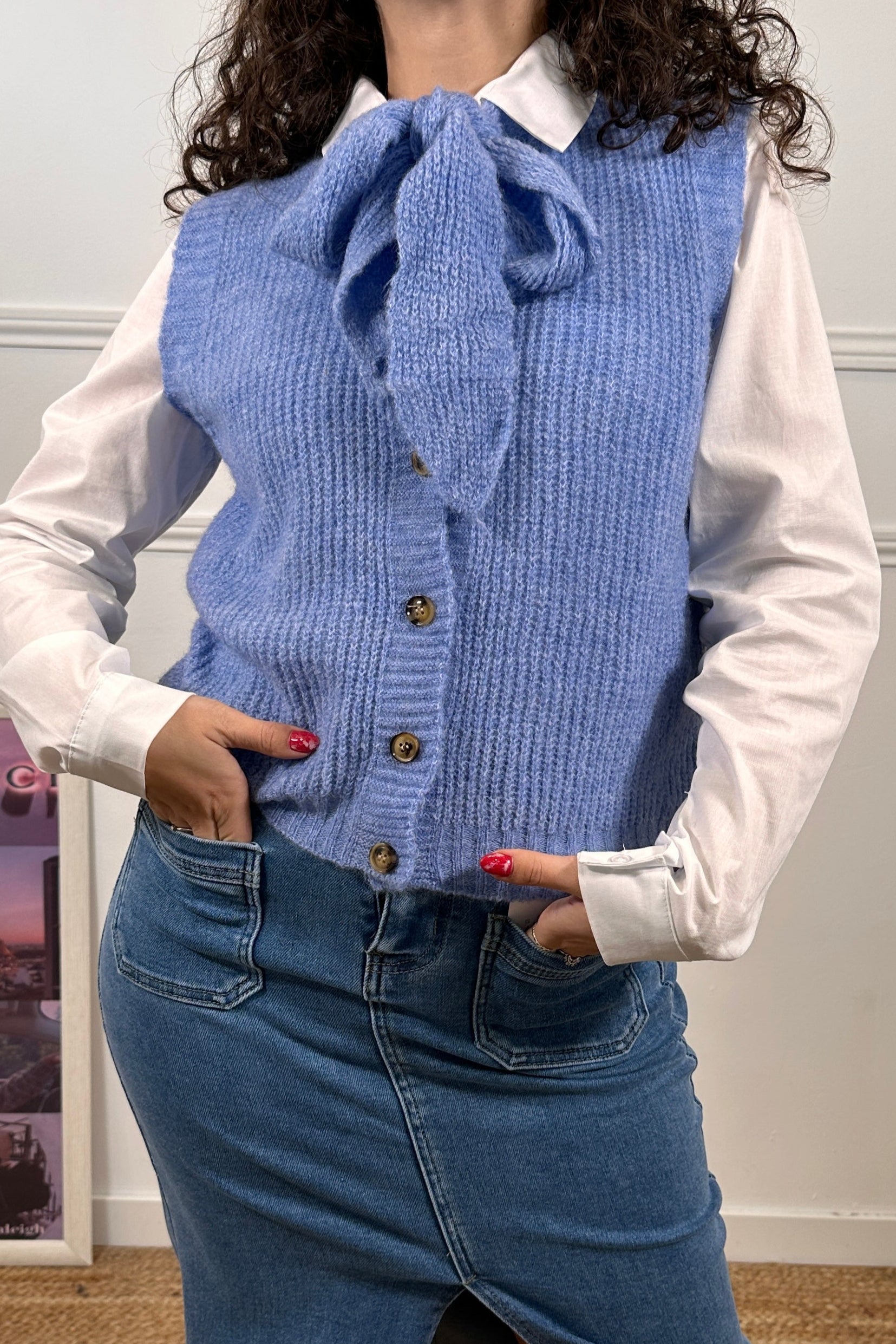 Dale un toque chic a tus looks con este precioso chaleco de punto abotonado , adornado con un detalle de lazada en el cuello que aporta estilo y elegancia. Disponible en los colores de temporada , es ideal para combinar con camisas o llevar solo. ¡Un básico renovado que no puede faltar en tu armario! 🧶✨