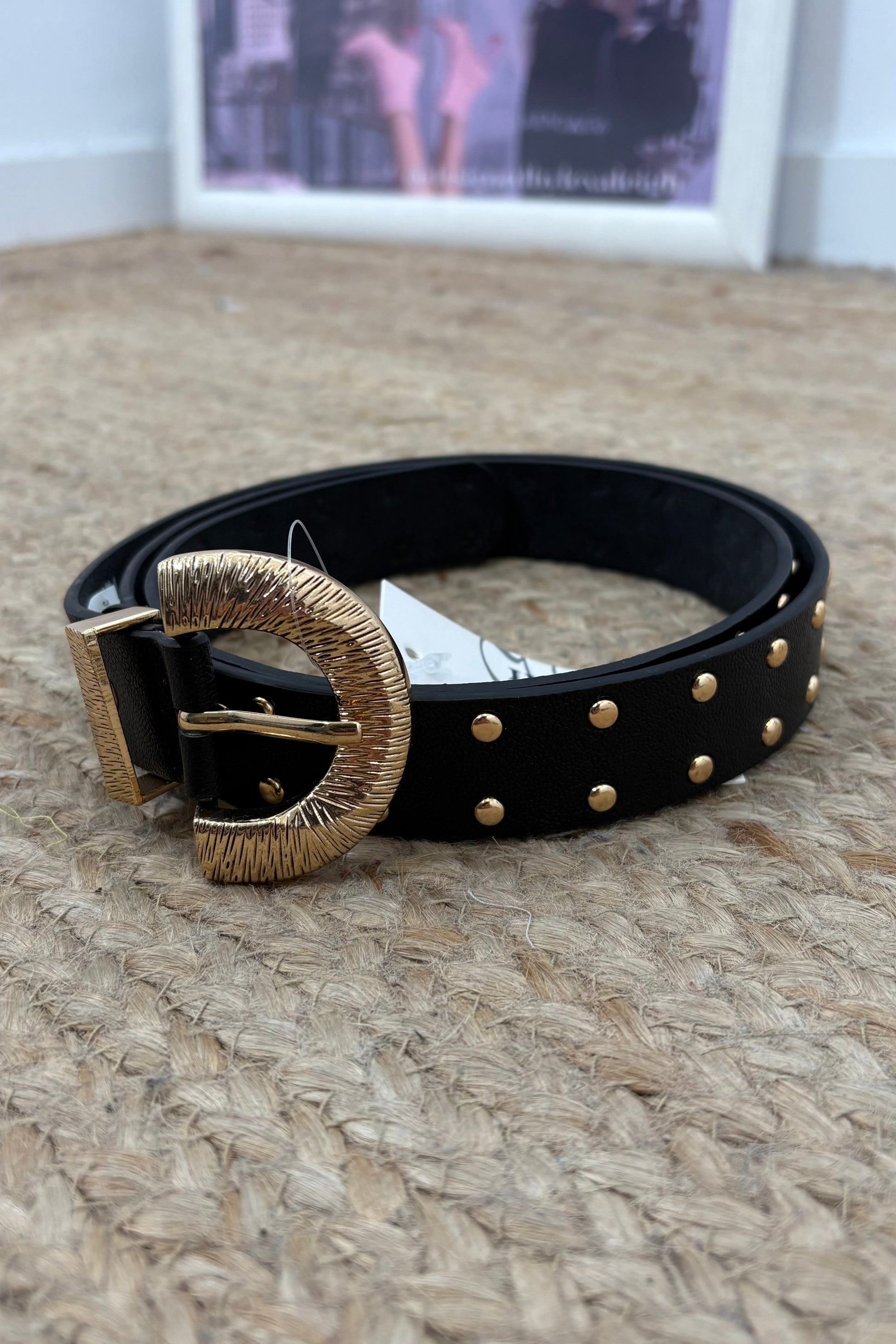 ¡El cinturón perfecto para tu look! ✨ Un cinturón básico con hebilla dorada que combina con todo. Las tachuelas doradas a lo largo le dan ese toque de estilo único y moderno. 🌟 Ideal para añadir un detalle de brillo a cualquier outfit, ¡es el complemento que no puede faltar en tu armario! 👗👠
