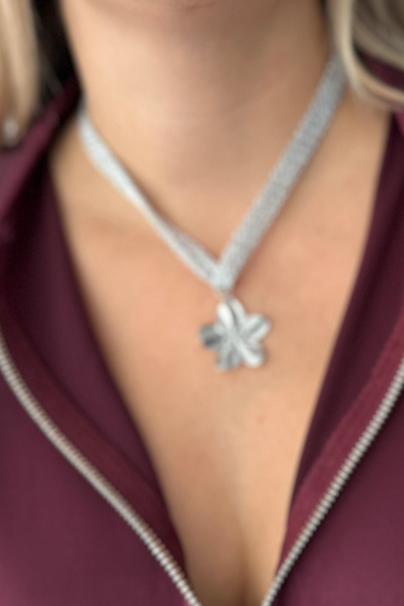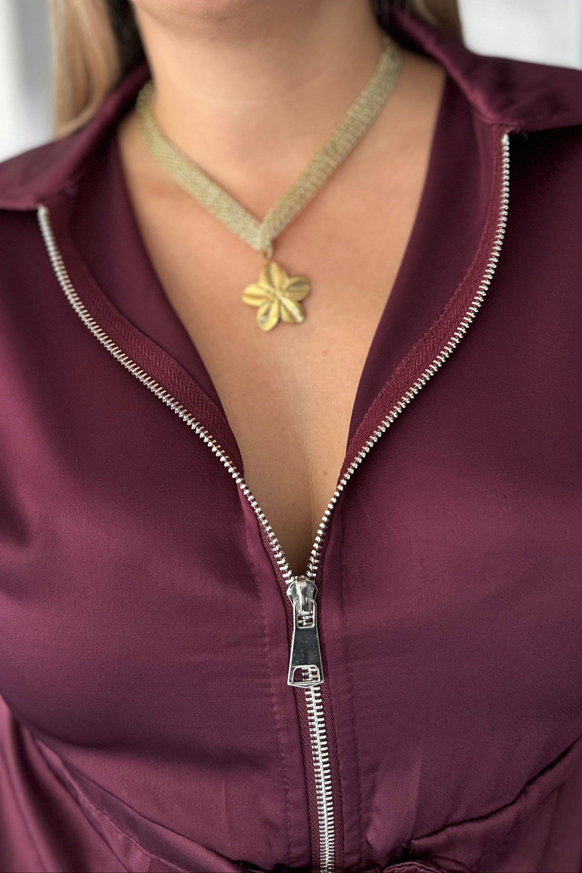Ilumina tu look con el Collar Flor Metálica, un accesorio elegante y versátil que se convertirá en tu favorito para elevar cualquier outfit.