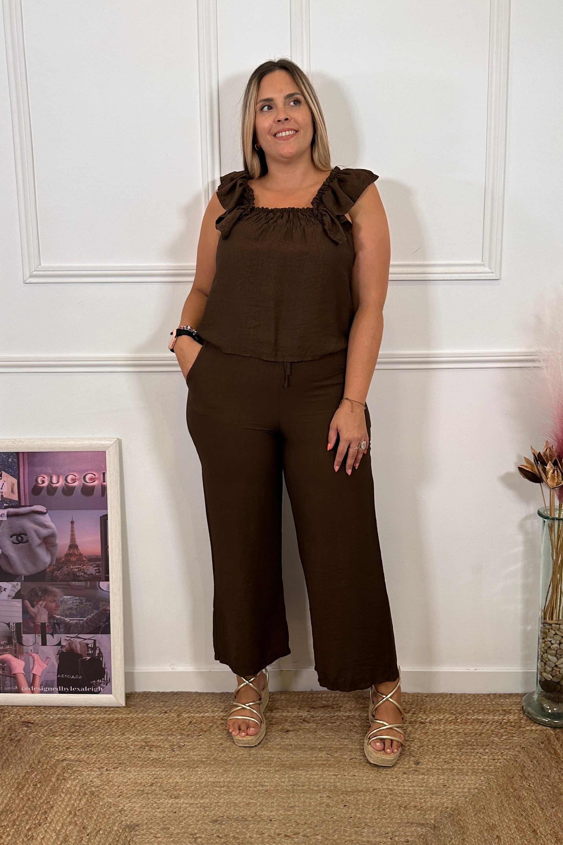 ¿Buscas frescura, rollazo y comodidad? Pues el Conjunto Habana lo tiene todo 😍. Un dos piezas con top fruncido y volante que puedes llevar con los hombros caídos o al estilo bardot 💃, y pantalón fluido con cintura elástica que no aprieta nada.