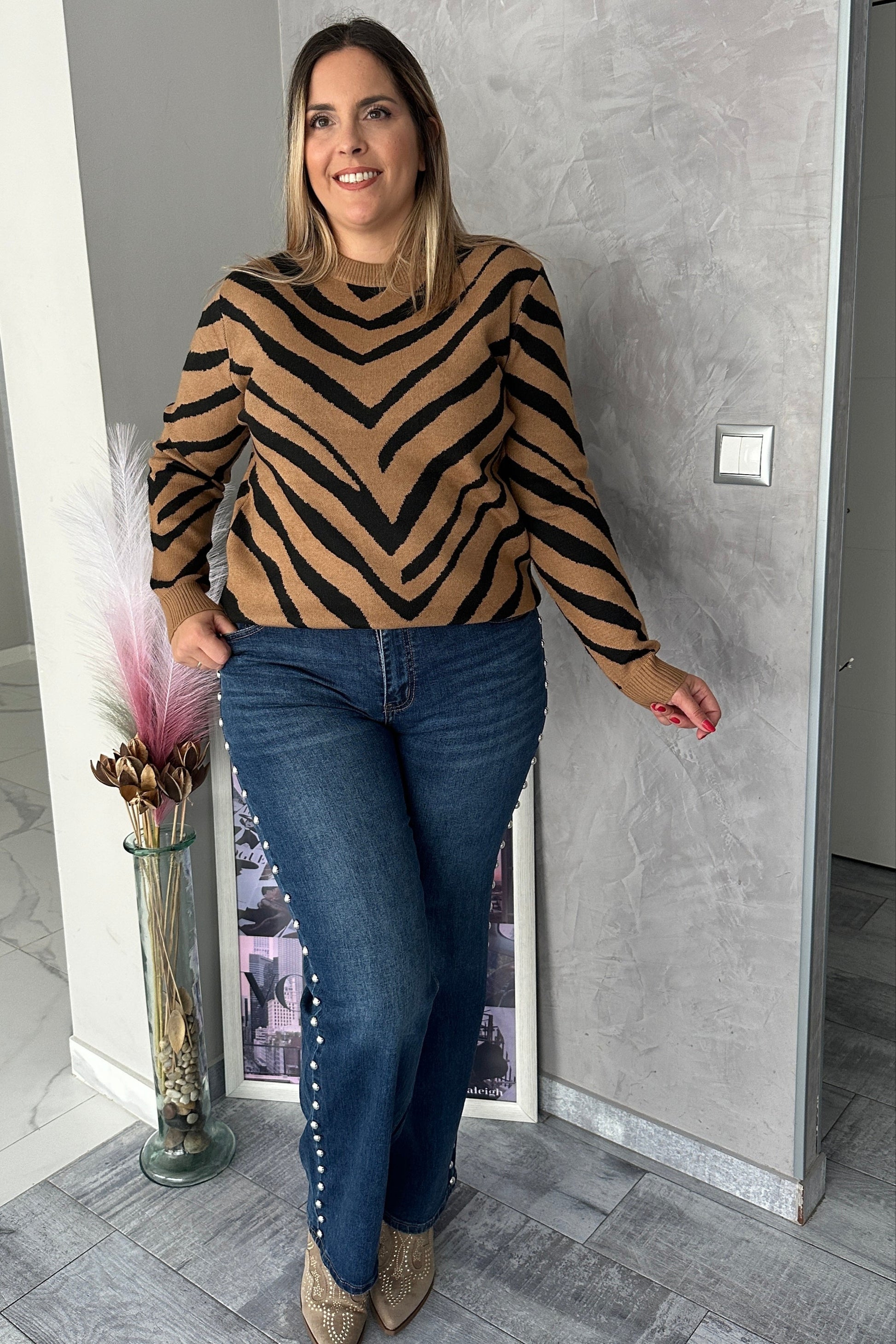 Los Jeans Tachas son la prenda que necesitas para darle un giro atrevido a tus looks. Confeccionados en denim de tiro alto y pierna recta, destacan por el detalle de tachas metálicas en ambos laterales, que aportan un aire rockero y sofisticado.