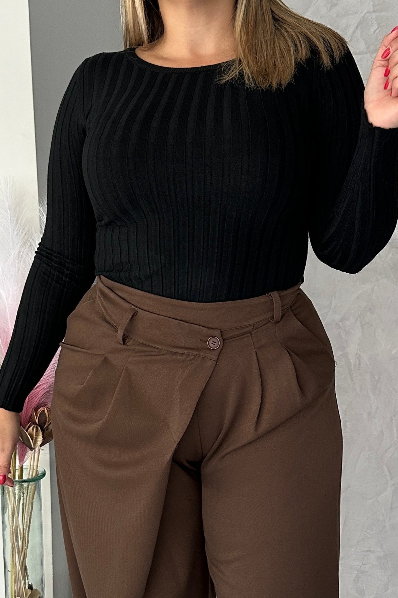El jersey canalé básico es un fondo de armario imprescindible. Su tejido elástico y suave se adapta perfectamente a la figura, ofreciendo comodidad y estilo en cualquier ocasión. Presenta un diseño de canalé fino, mangas largas y un corte recto, ideal para combinar con faldas, jeans o debajo de tus chalecos favoritos.