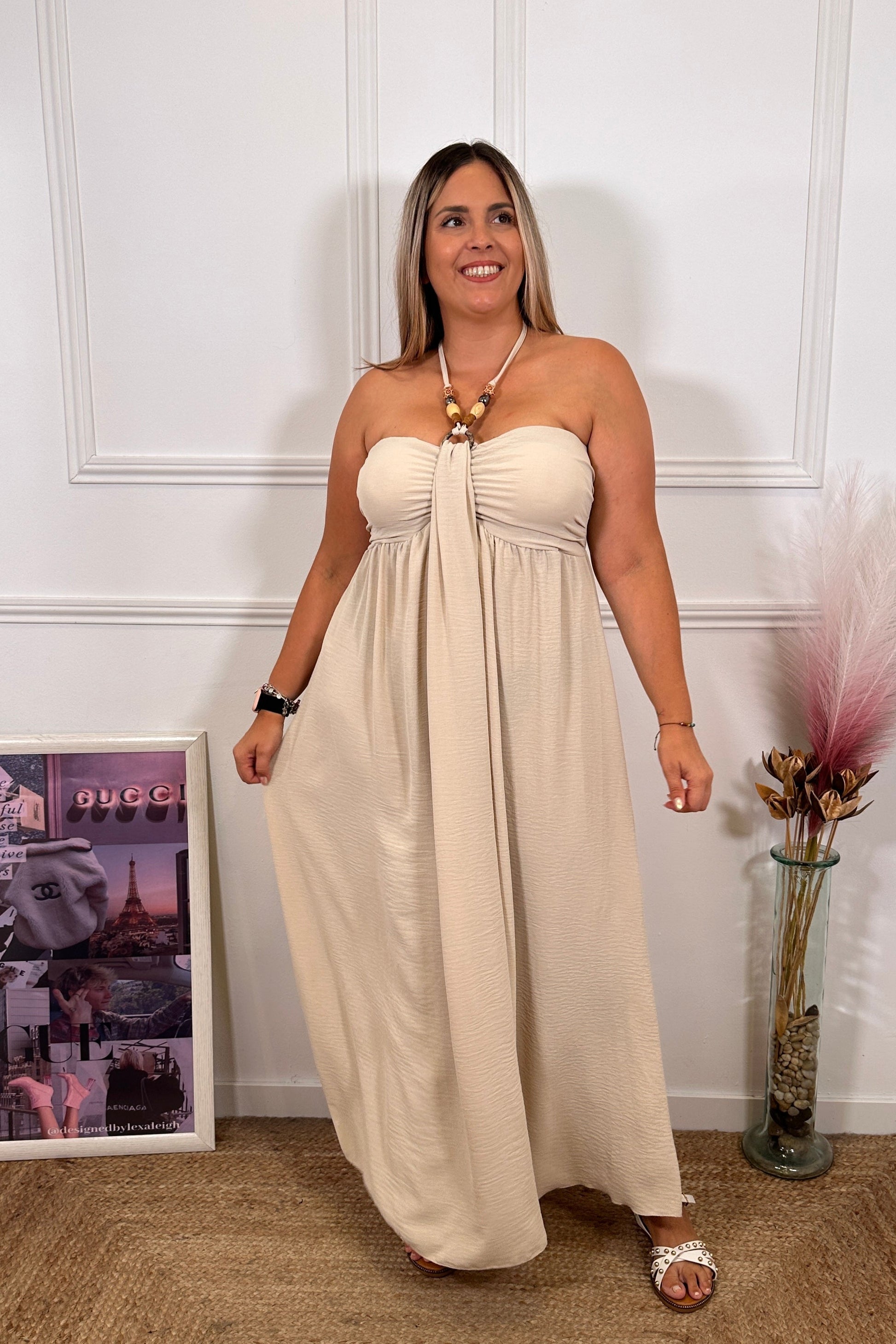 Este vestido es puro flow veraniego 😍. Tiene un escote palabra de honor con nudo central, detalle de cuentas en el cuello que le da un toque boho-chic, y una parte trasera nido de abeja que se adapta genial al cuerpo. ¡Y sí, está disponible en más colores! 🎨