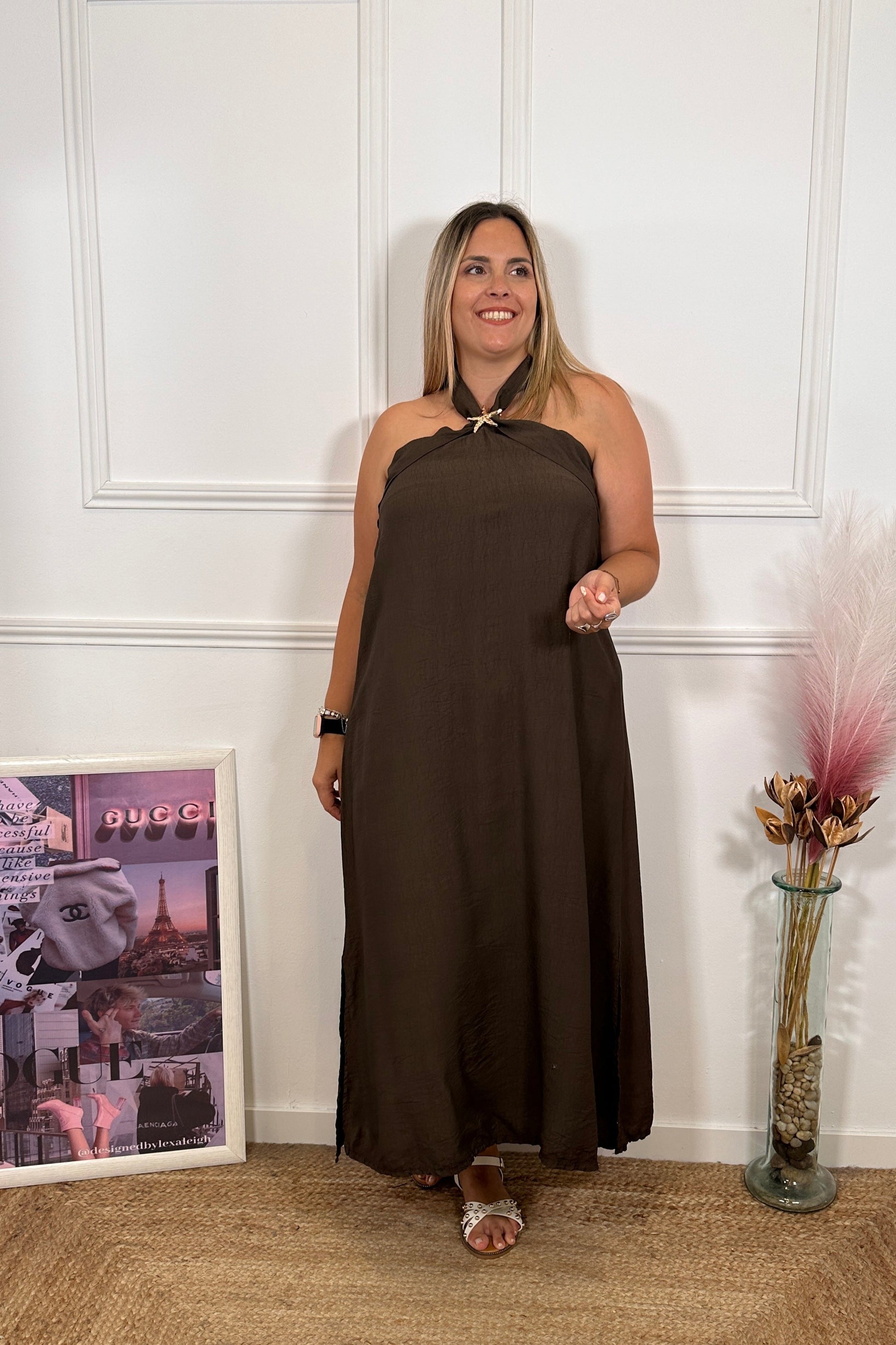 Con un escote drapeado precioso, tirantes finos y un broche de estrella de mar dorada (¡se puede quitar!). La tela tiene caída, no marca y sienta de escándalo 🤎