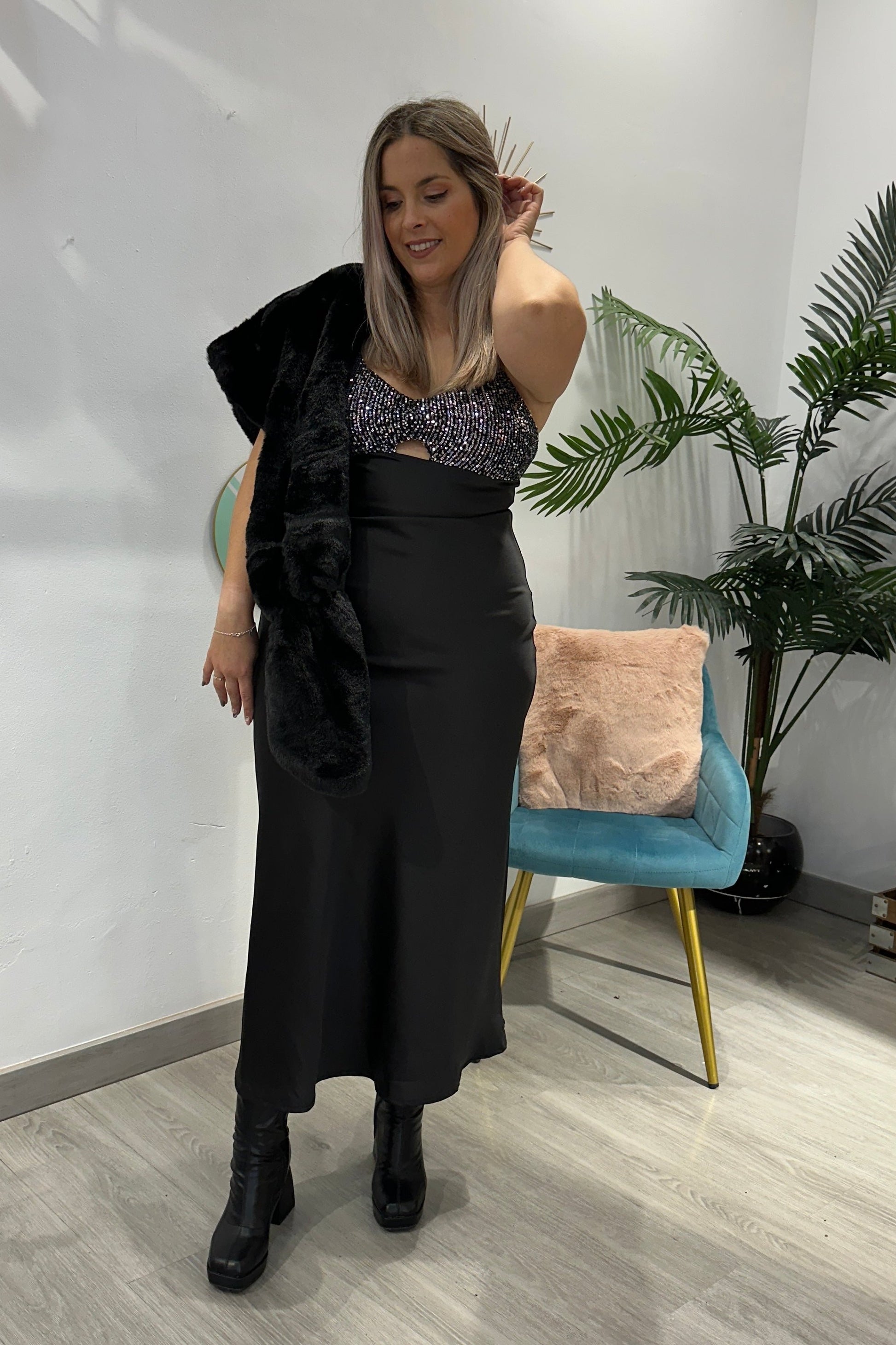Precioso vestido de tejido raso con elástico y escote en lentejuelas, lleva tirante regulable.