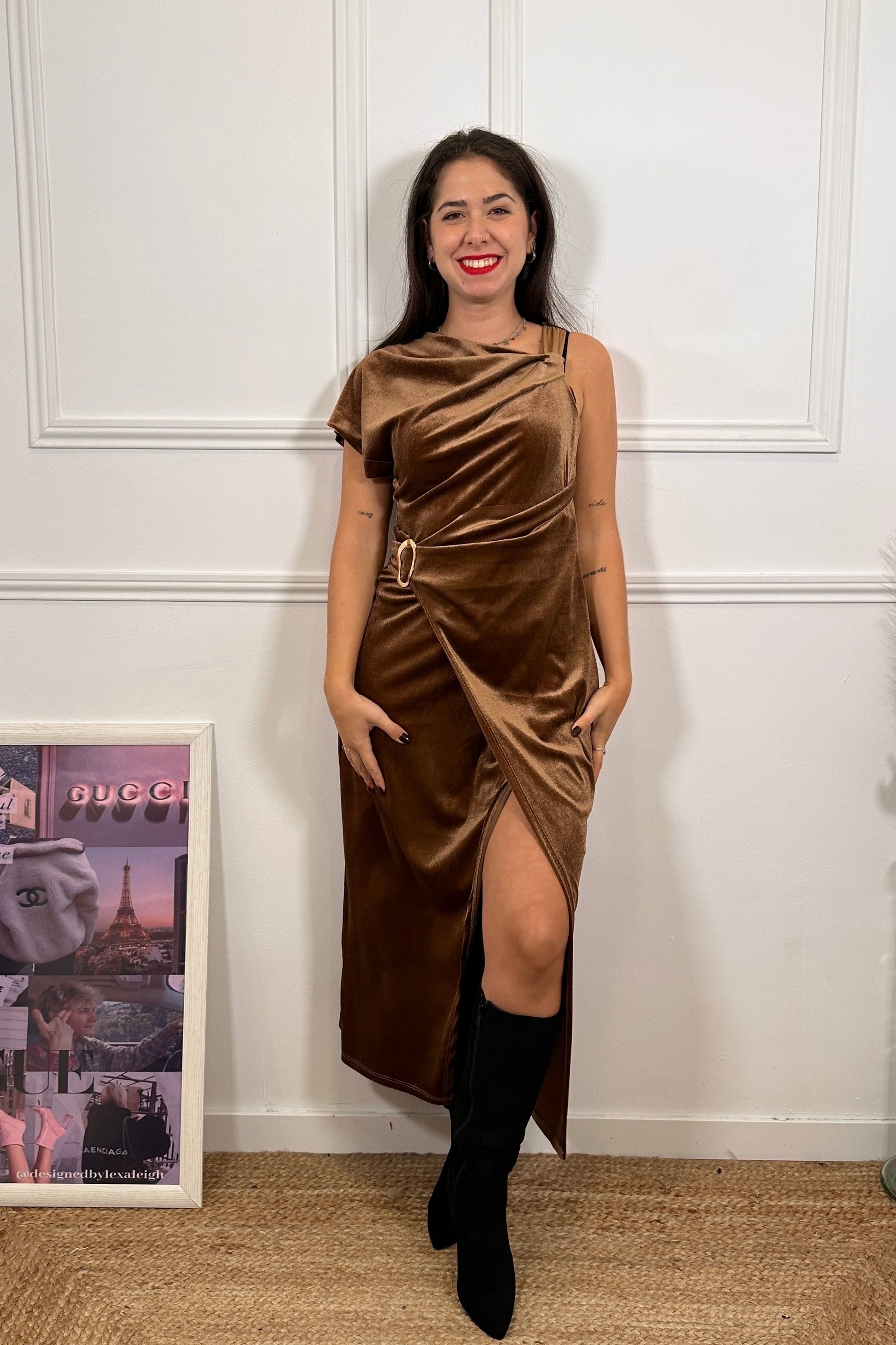Vestido de terciopelo, elegante y sofisticado, con manga a la sisa y un fruncido en la cintura adornado con un broche dorado que resalta la figura. Su corte midi y la falda cruzada le aportan movimiento y estilo, convirtiéndolo en una opción ideal para ocasiones especiales. ¡Un imprescindible esta temporada!